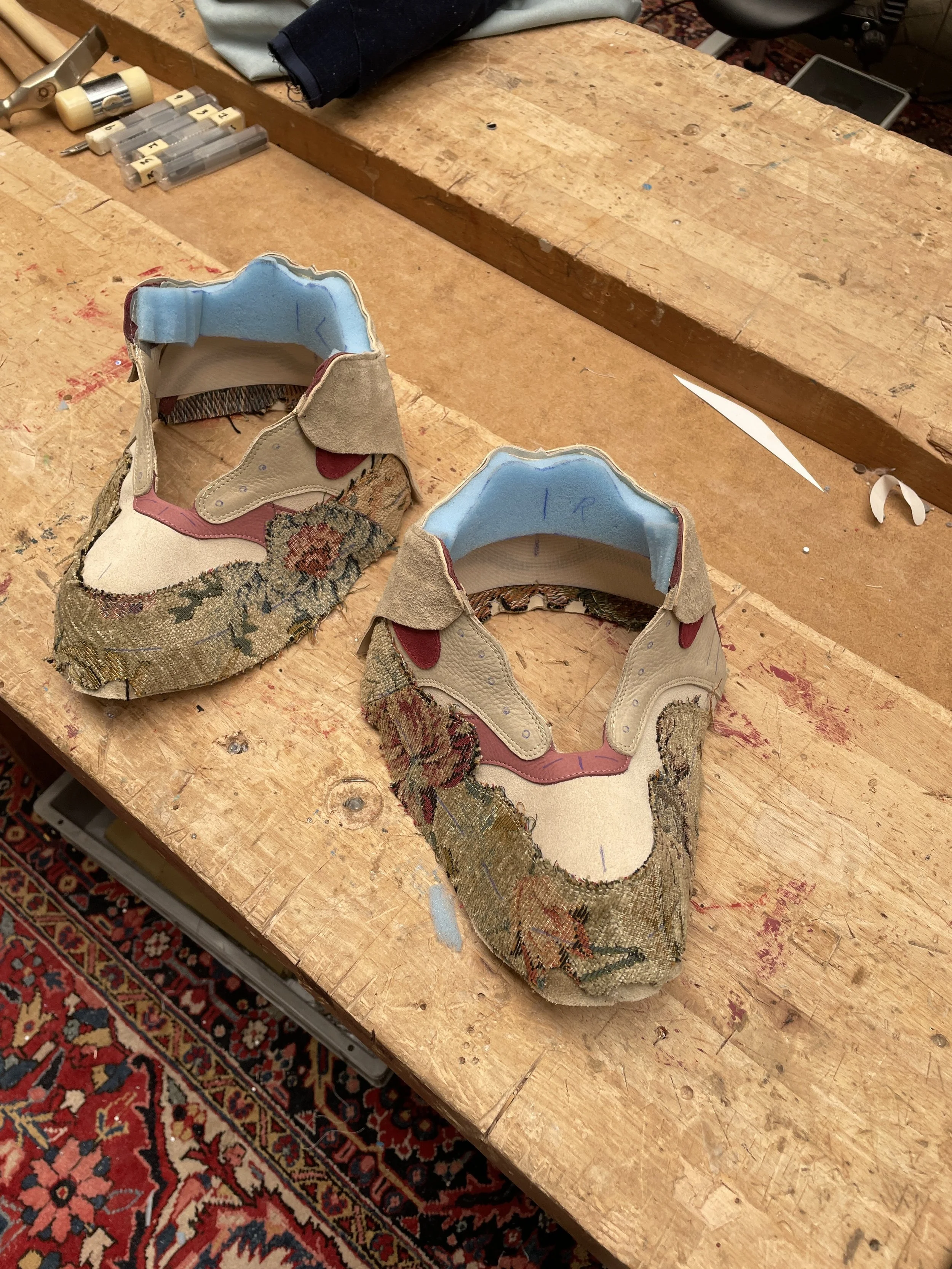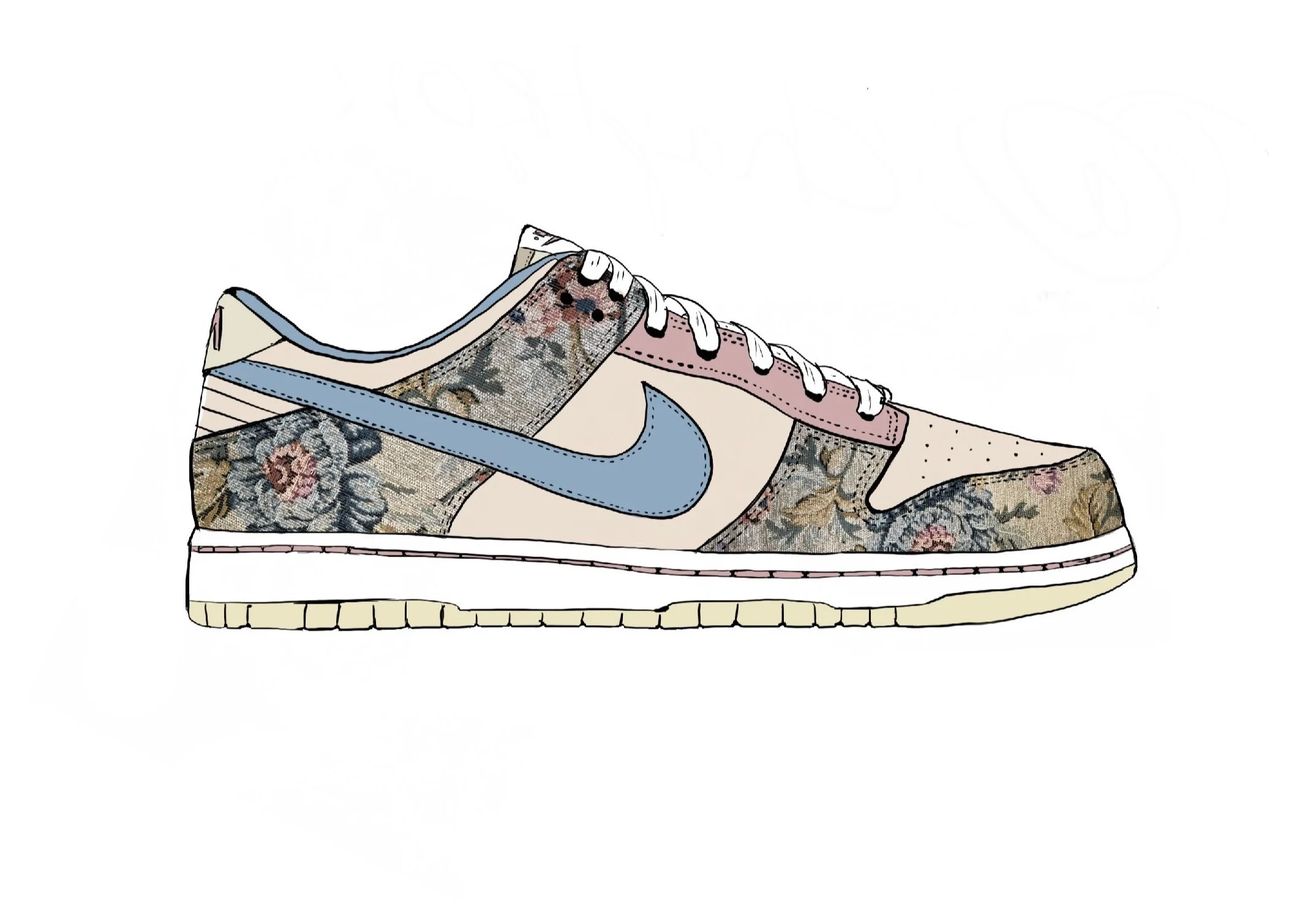 The first version of this shoe was made on March 22, 2021. The fabric of the 70-year-old chair was then applied to a Dunk and Air Max 1. In a year and a half, nothing was done with the design until we decided to sacrifice the chair and finally use the fabric for shoes.